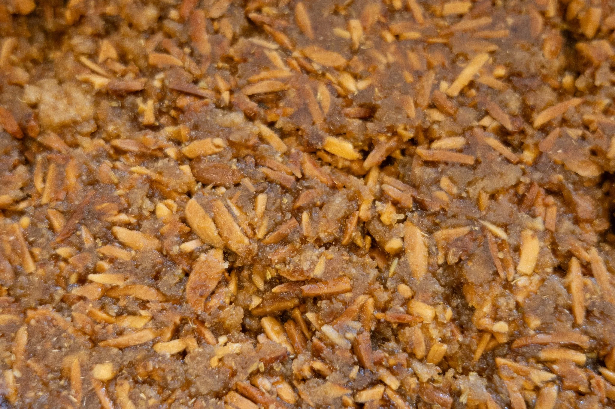 We usually make this recipe with old sourdough bread. Any bread would work well, though stronger-flavoured breads like rye bread would affect the flavour profile. You could also experiment with the texture of the breadcrumbs, which could be ground up fine or kept in rougher pieces for different textures in the end product. It may even be possible to use old pastries instead of bread, though you should use ‘plainer’ pastries rather than those filled with e.g. cream, which probably wouldn’t work so well. We haven’t tried making alajú with pastries, but if you do, you’d need to adjust the recipe to account for differences in sugar and fat.