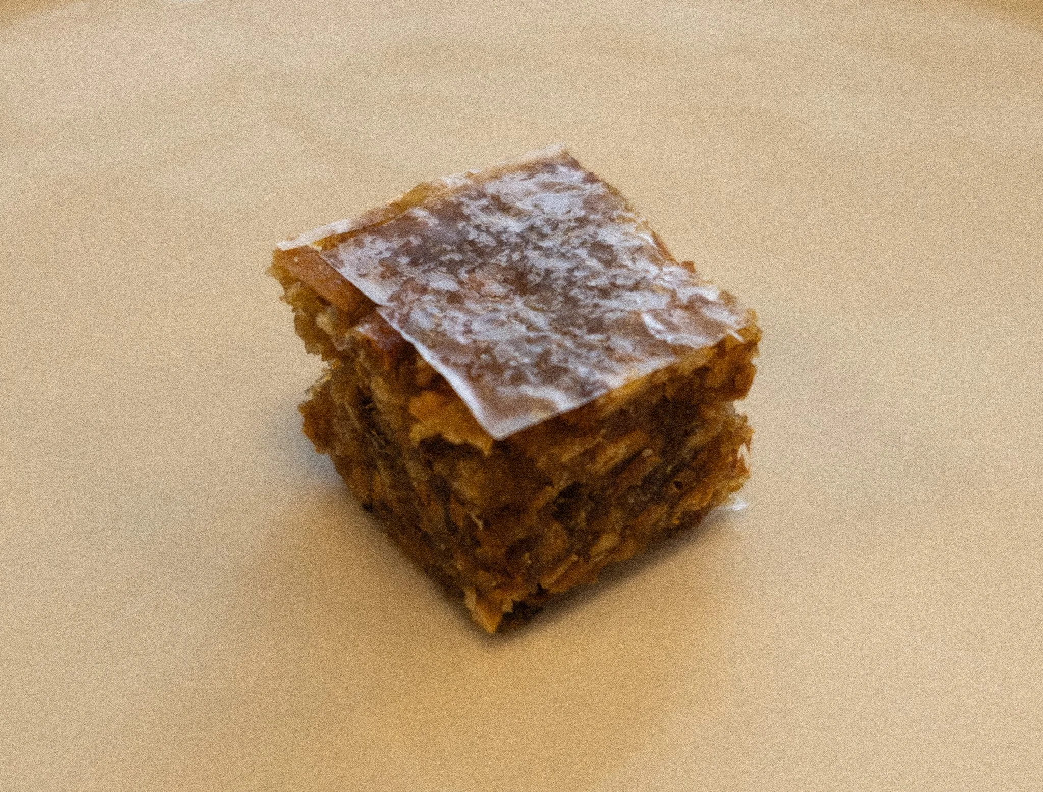 After pressing, the mixture should set, something between fudge and a cereal bar in consistency. Slice the set mixture into individual servings. Optionally, cover the top and bottom with edible rice paper before slicing so the pieces can be eaten without getting sticky fingers.