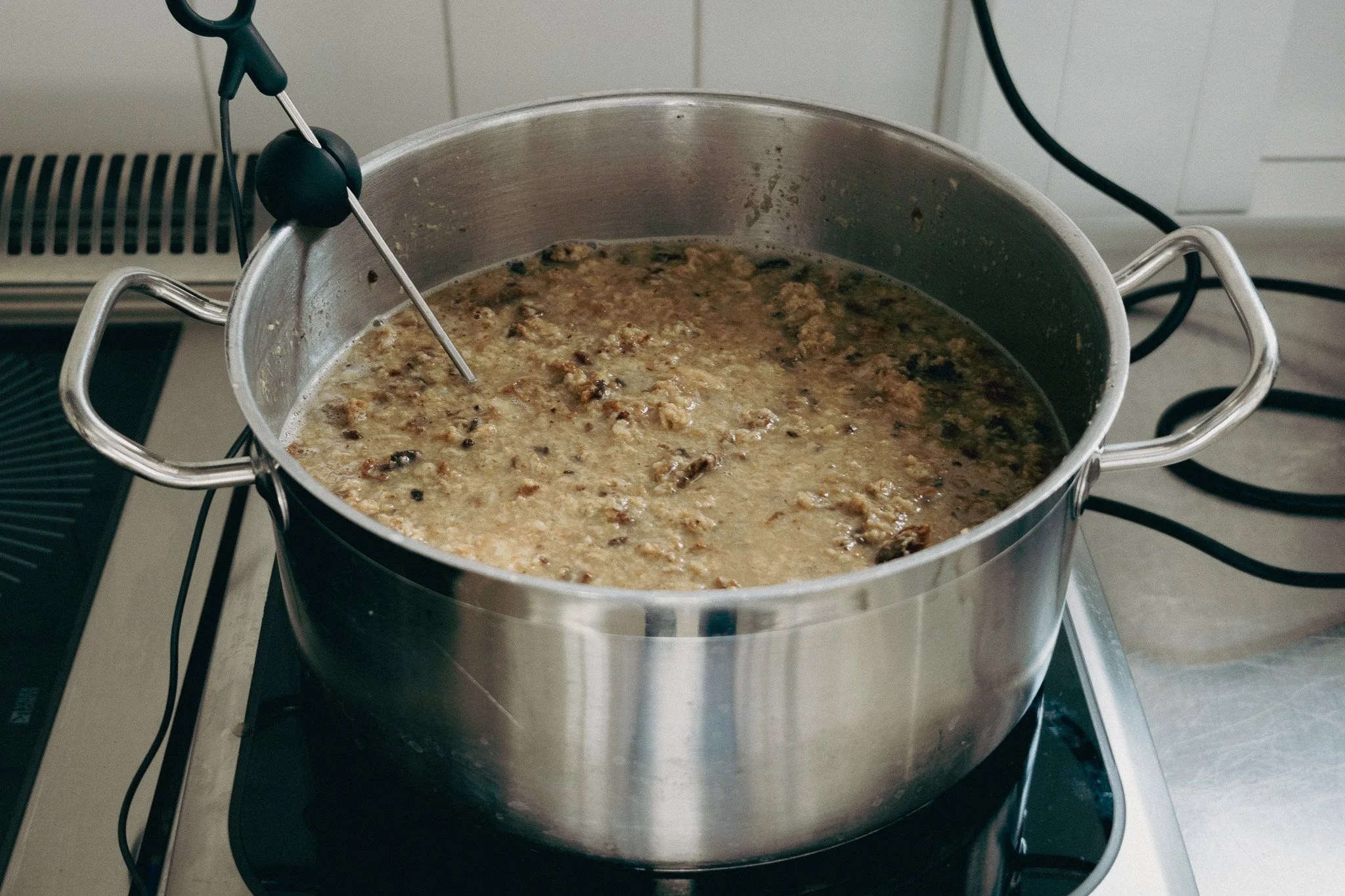 Strain the mixture through a fine muslin cloth. If you want to make miso with the solid by-product, for best results, leave it straining in the fridge overnight—the more syrup removed, the better. You can also further filter the strained liquid to make a clearer syrup, if desired, e.g. through ice filtering.