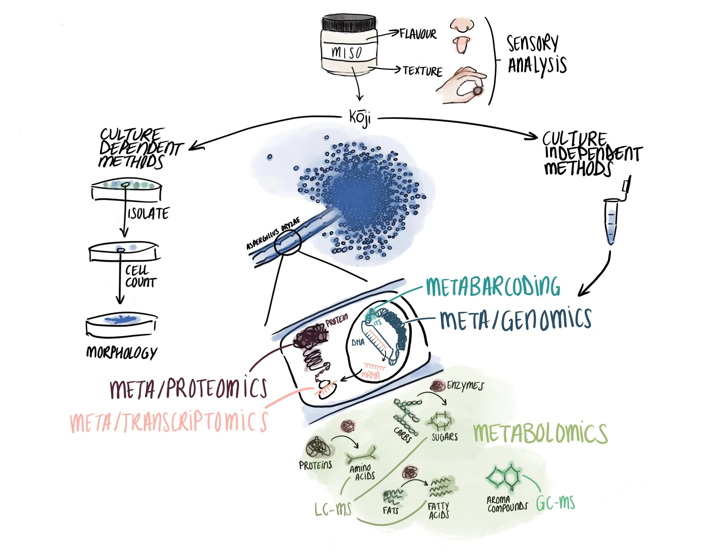 Whilst metagenomics can reveal the overall genetic composition of a sample, it cannot differentiate between cells that are dead or alive, as it only analyses DNA, regardless of where it is found. Culture-dependent methods can again help here: after cultivating the microbes in a sample, plate counting can be conducted to estimate the number of viable, or living, colony-forming units (CFUs) in a sample. This is a fairly straightforward method—it involves simply counting the dots on the plate by hand. Flow cytometry is another technique that can be used to measure the proportion of active cells in a sample. The abundance of active microbes determines, for example, the concentrations of the metabolites that they produce, which in turn determine fermented food characteristics. For example, in 3-month-old miso, despite the essential role of A. oryzae (in the form of kōji) in the early stages of miso production, plate counting reveals that it doesn’t appear to be active in large quantities after 3 months, even though the relatively high abundance of its DNA in a sample might suggest otherwise. This is a good example of why it is so important to critically interpret and contextualise one’s data. In some of our novel miso data, for example, we had large amounts of A. oryzae reads, and if we didn’t know about the microbiological and culinary context of miso, we might then conclude that there was lots of A. oryzae actually living in the finished miso. Integrating different kinds of data helps tell a fuller story.
