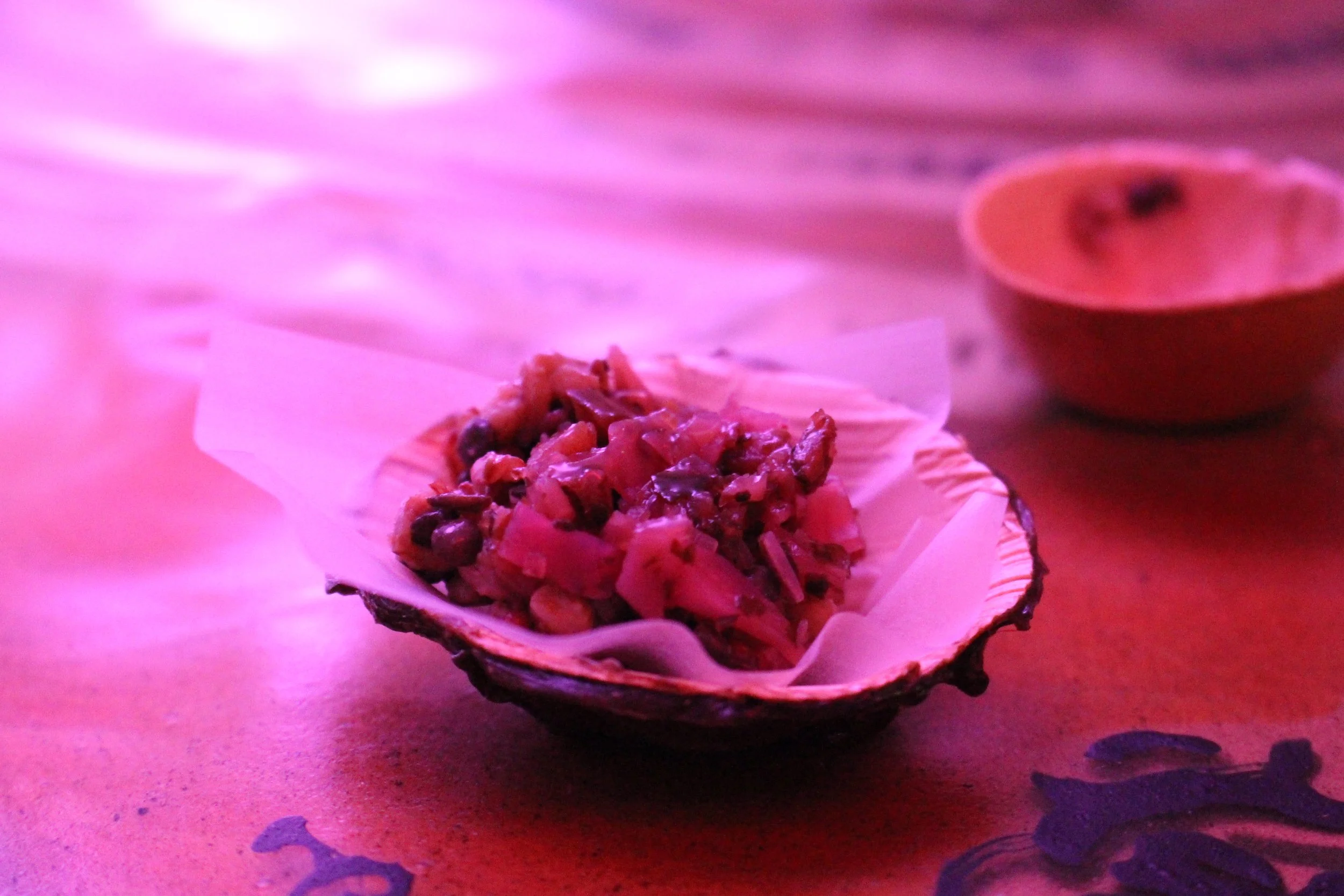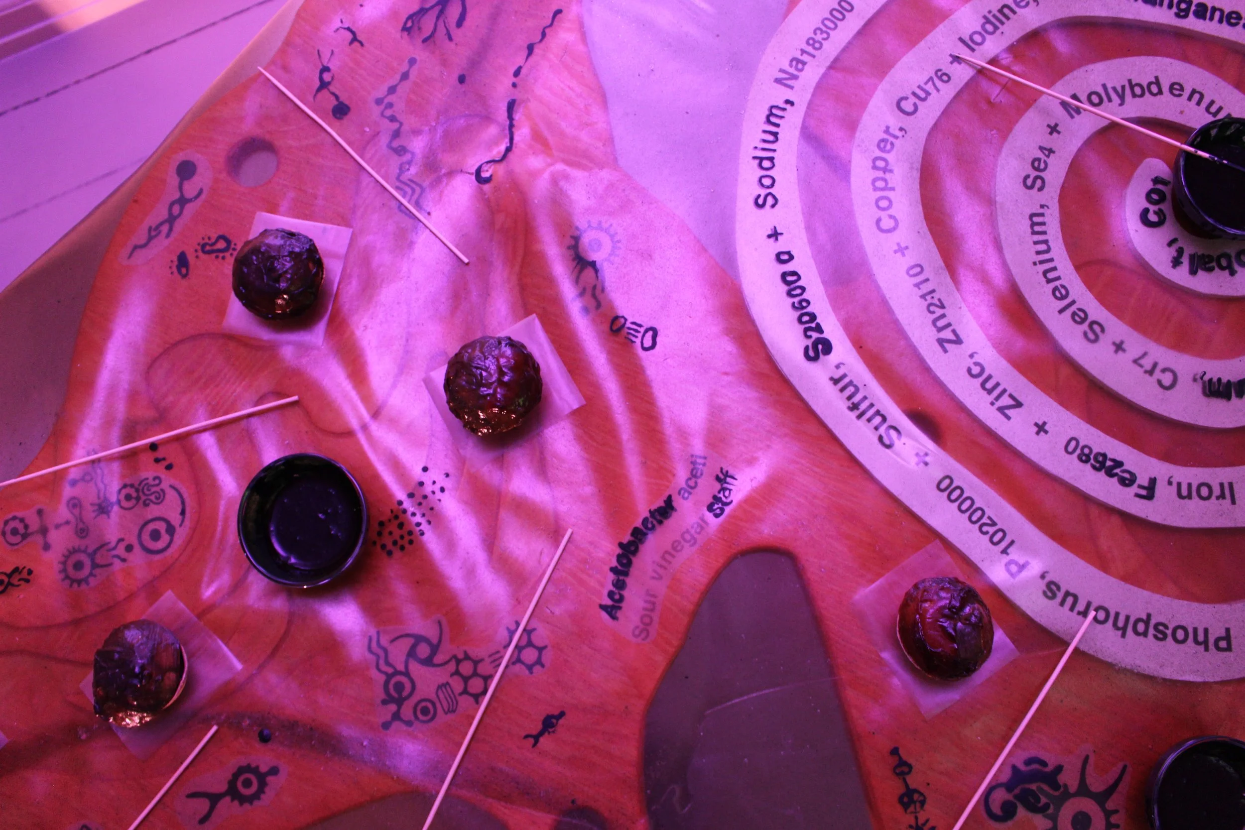 Once your group, just under thirty, has assembled, a host addresses you, a group of symbiotic metabolic companions. When you enter the space, the guide tells you, you will encounter a series of flavourful encounters. In each, there will be a short incantation and something to taste. You will be invited to activate the encounter together by each reciting one line of the incantation. Your guide will offer you a taste of that encounter, share its story with you, and invite you to explore different dimensions of being a holobiont, through reflection, discussion, and play.