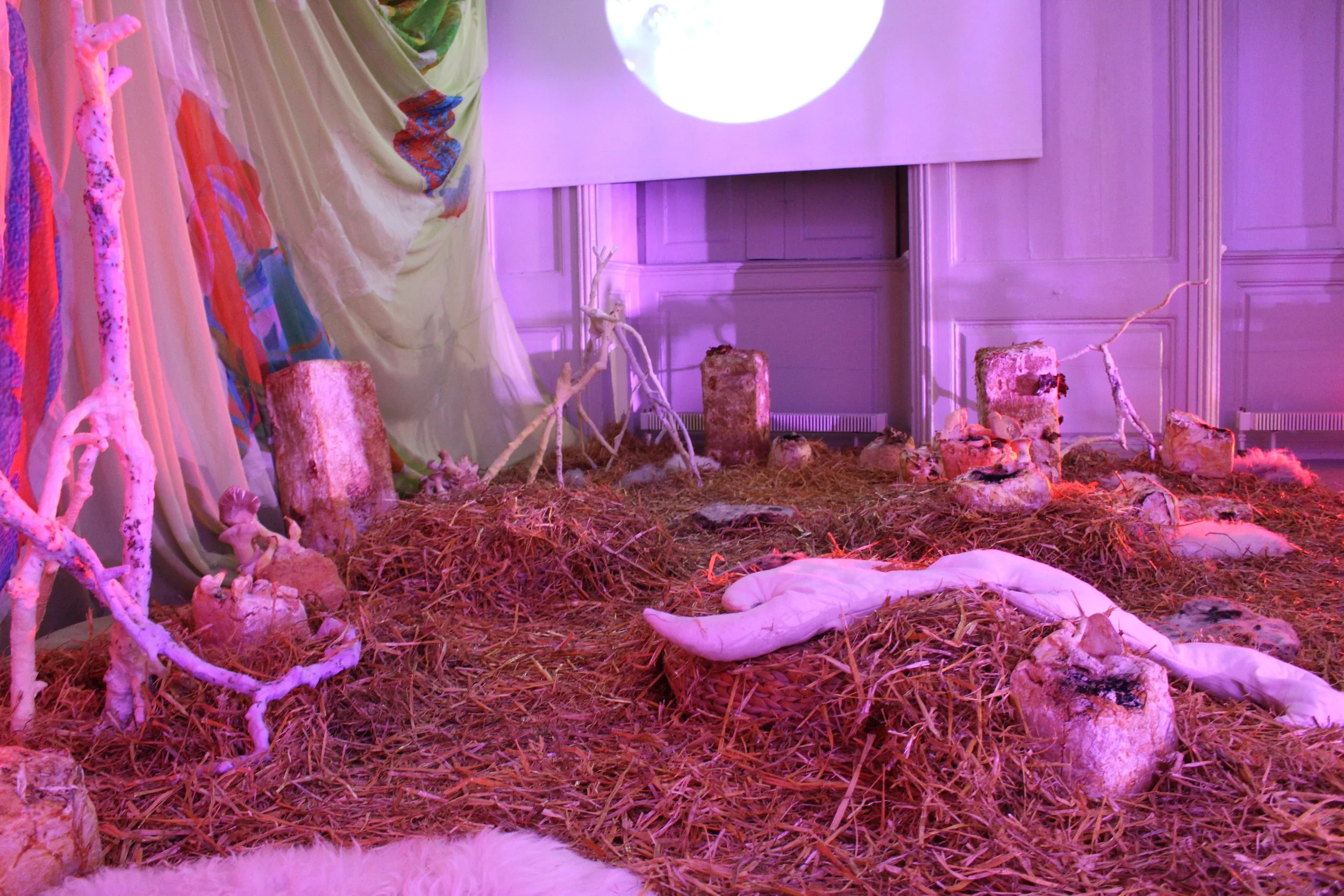 From here, the guide turns you loose to explore a blasted landscape, where you can forage on your own for your next taste. They do not tell you what it is, other than you’ll know it when you find it. You step into a corner of the room strewn with straw, blocks of mycelium with mushrooms sprouting from them, and branching sculptures of fluffy white. Cushions and woven straw seats beckon you to sit and lie, getting low to explore. A meditative video with the incantation loops above.