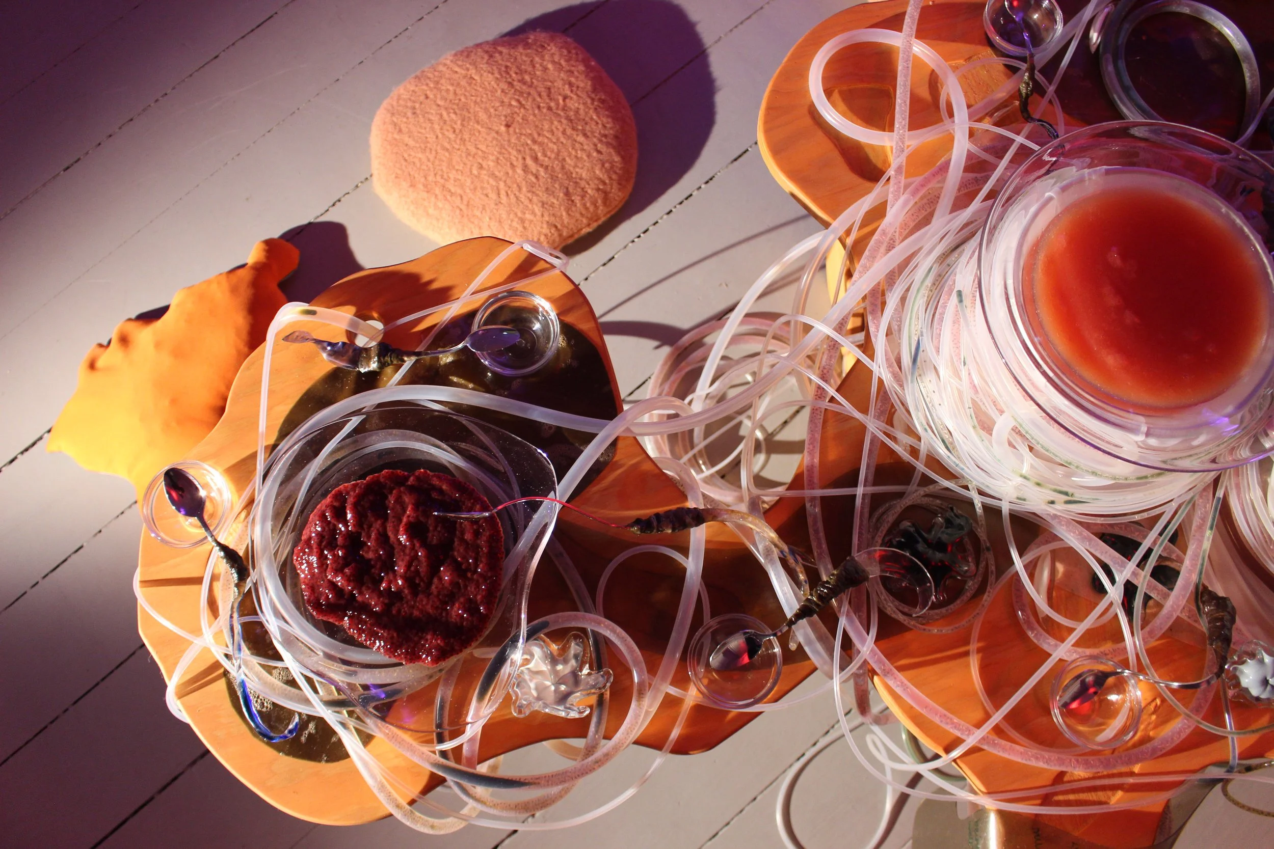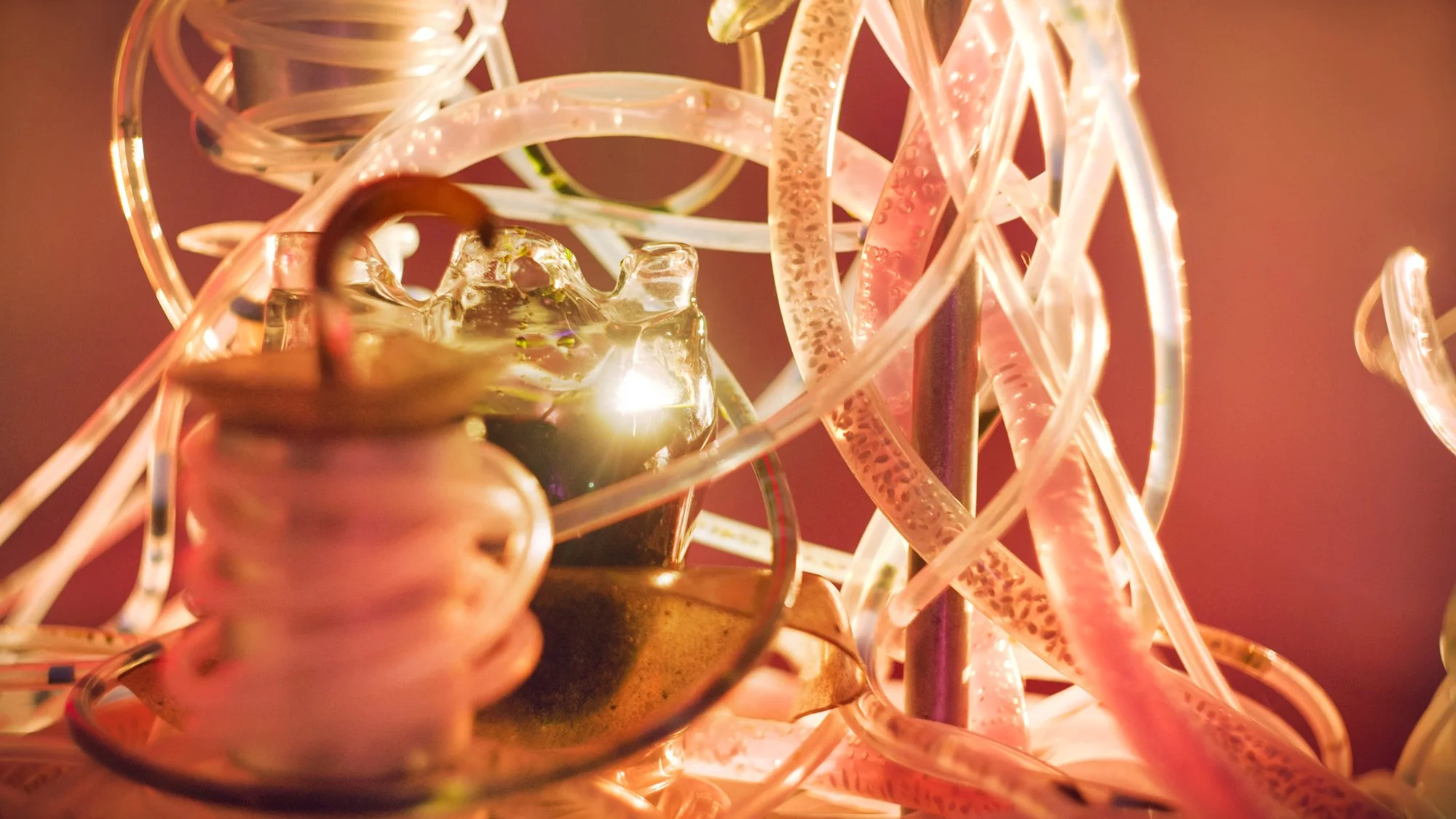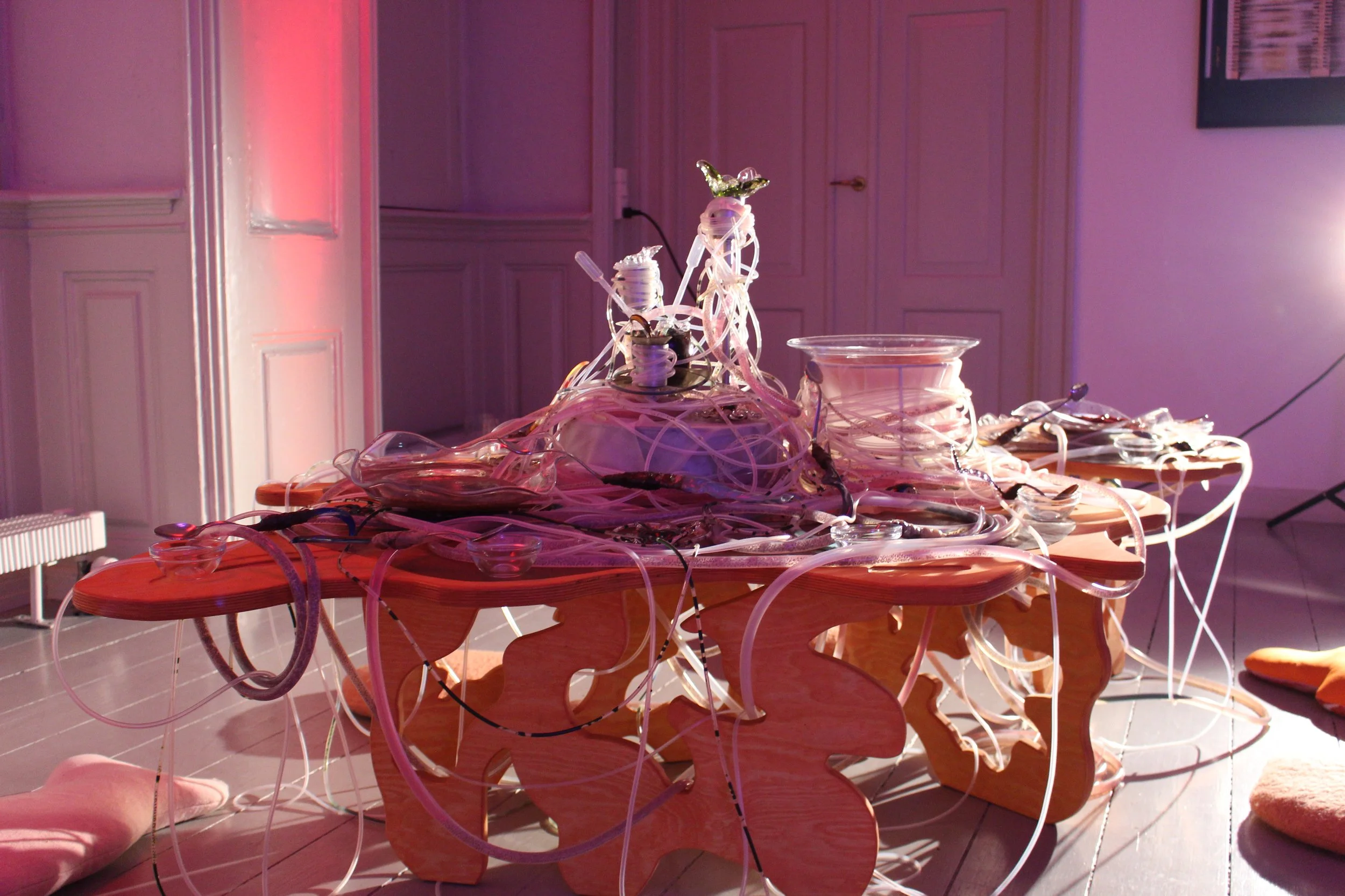 After relaxing in the straw, a guide collects you and brings you to the final encounter in the room—a table wrapped with translucent bendy tubes in different thicknesses, coiled around wide glass bowls filled with different coloured substances. Some of the tubes seem to be filled with what look like tiny seeds suspended in a pink gel.