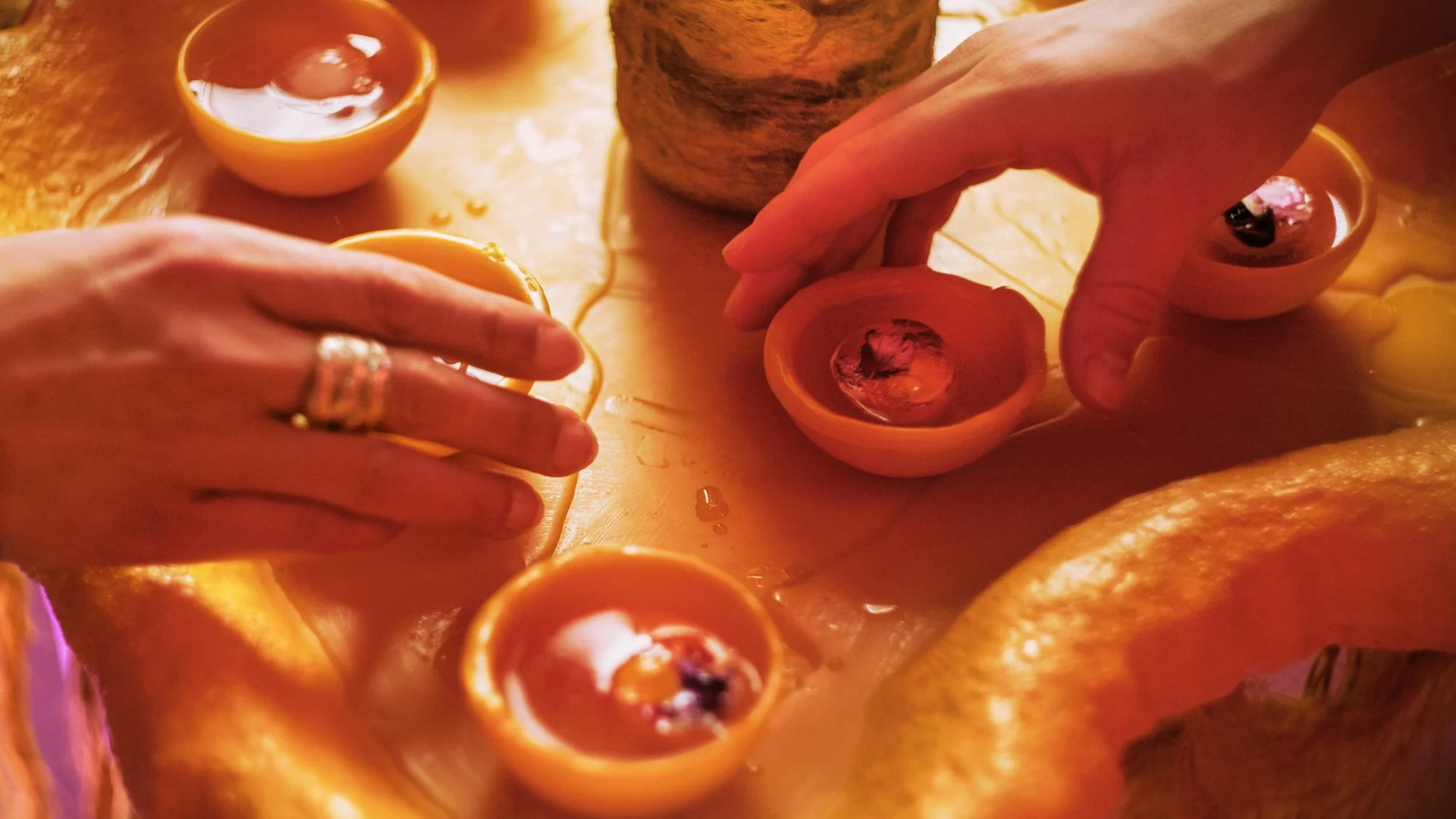 A new guide beckons you to a tall nearby table, festooned with what looks like yellow wool. On it are small yellow hemispherical cups. The guide pours a bubbly liquid into each cup, and invites you all in a collective toast. You take a cup and hold it to your lips. Fruity, floral aromas and tiny, tangy bubbles dance on your upper lip. A pleasant herbal woodiness hangs in the background. The cup itself, you notice, is made of beeswax, with its heady fragrance. A spherical ice cube bumps against the cup’s edge; as it melts, petals within it unfurl.