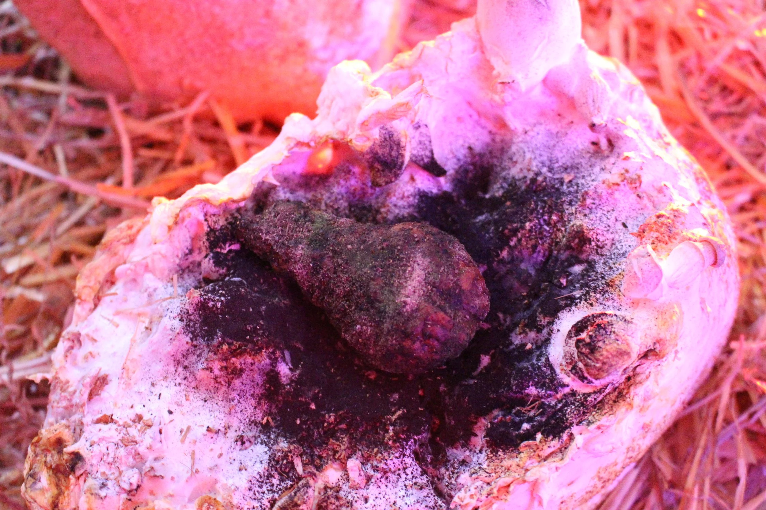You gingerly pick one up nestled among some mushrooms on one of the mycelium blocks. It fits in the palm of your hand, and is surprisingly heavy. You smell it—deep, foresty aromas, with an enticing savouriness. You tentatively take a bite. A crisp vegetal shell yields to your teeth which sink through to something soft, dense, and rich. Pleasing notes of mushroom fill your mouth and nose, cut through with a hint of fruity acidity. You take another bite, more confident this time, enjoying the moreish morsel with gusto. You look around you—your group are similarly enjoying their finds, some slightly bewildered, some entranced.