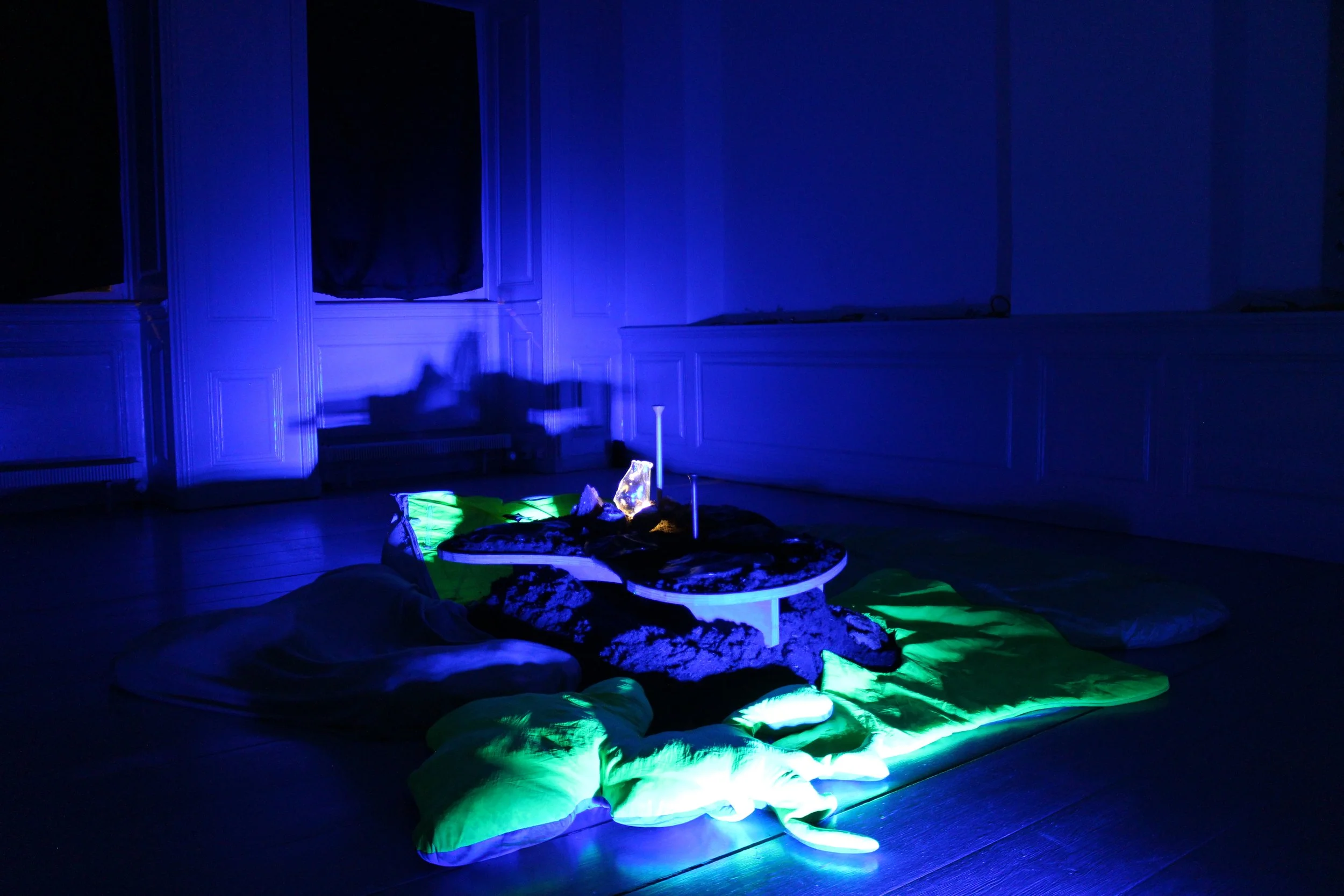 A mound of earth, heaped upon and surrounding a low table, is circled by cushions, filling the middle of the small anteroom, dark and lit by violet. An atmospheric, textured soundscape suffuses the space, intensifying the dank, rich smell of soil. The guide invites you to join them around the earth table. The guide picks up a textured linen cloth, and begins rinsing their hands with it. With a gesture, they invite you to do the same. The intense soily aroma seems to emanate from the cloth, though it is clean and lightly steaming. The guide puts down their cloth. You follow. They lift their hands to their face and inhale deeply. You do the same—and are enveloped in a humic cloud.