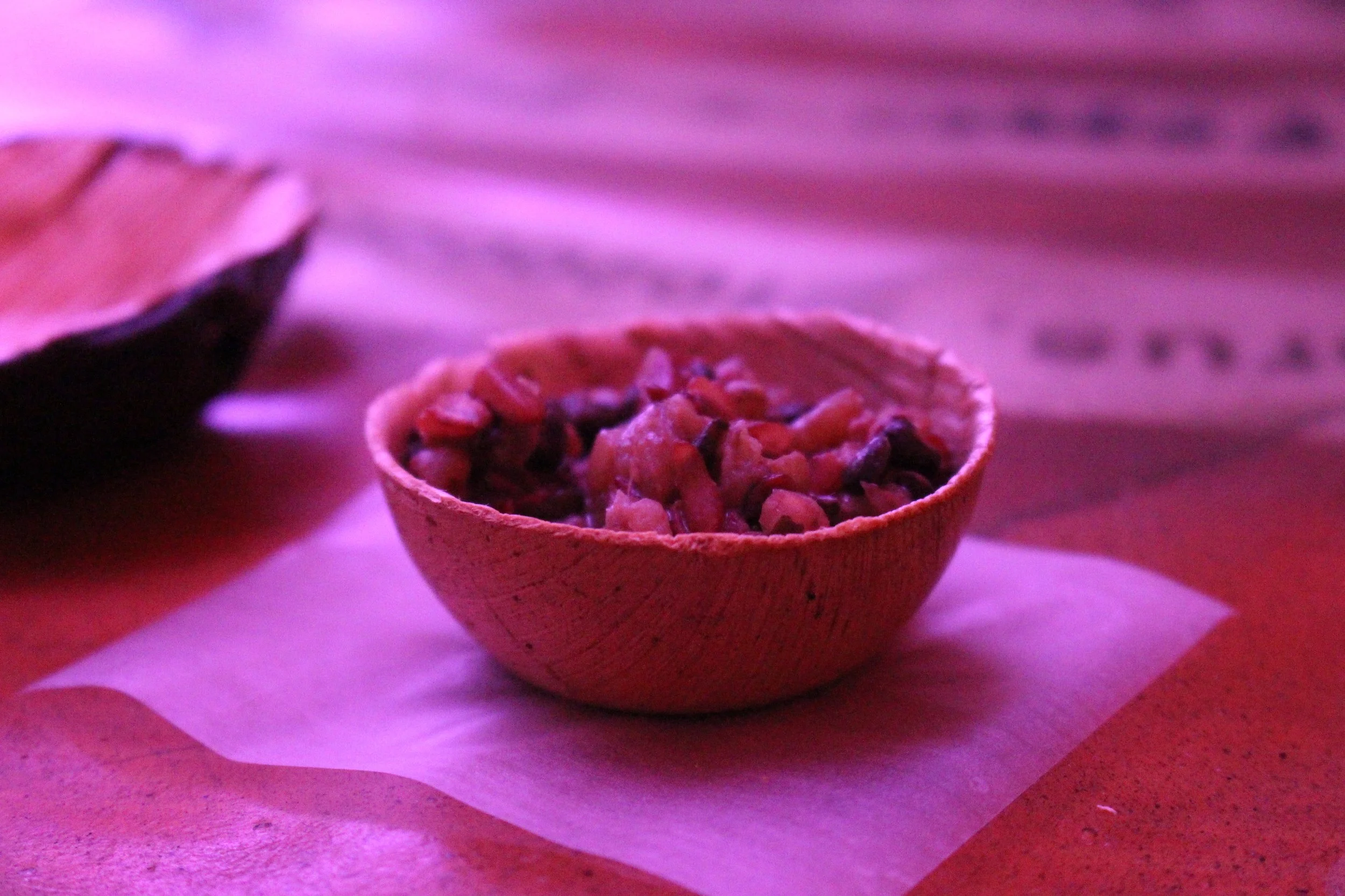 These microbes, your guide describes, especially in the gut, thrive on prebiotics—foods high in fibre, and sugars and starches otherwise difficult for our body to digest. Which is the theme of your next tasting. The guide invites you to pick up one of the small brown cups lidded in soft, smooth, slightly tacky algal leather, and to hold it as you recite the incantation, winding through the card intestines hanging along the wall.