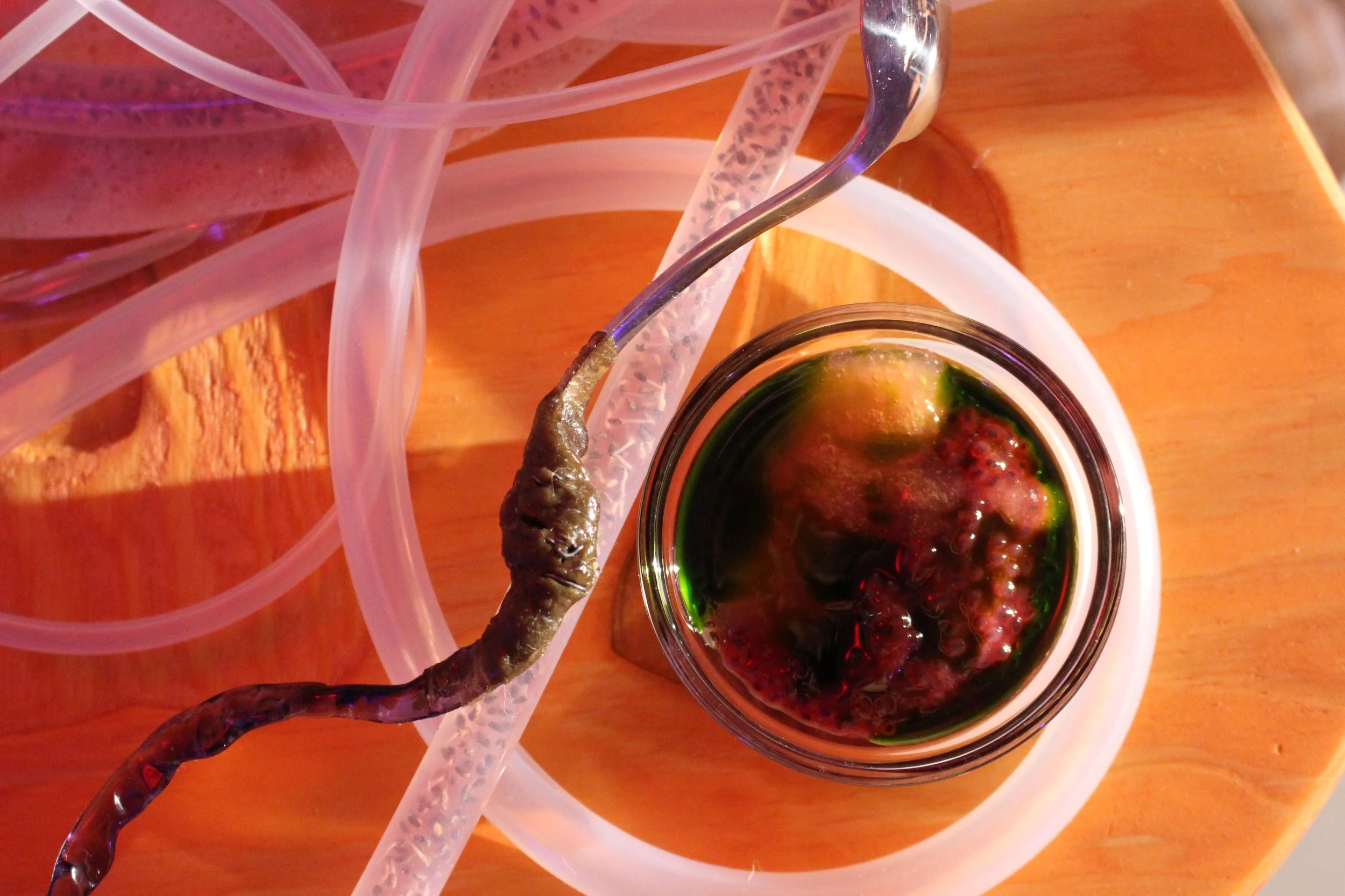 For dessert, you are invited to assemble a medley of flavourful slimes, to inhabit it as our gut microbes do. The guide shows you how to assemble your own dessert in a small glass bowl from the large bowls on the table: chia seeds jellied in caramelised honey, basil seeds slickened in raspberry purée, and guava gel, topped with a pool of jewel-green basil oil. You pick up a spoon with a twisted blown-glass handle and dig in, noticing how the different textures of slime and the oil mingle but do not mix, a separate togetherness echoing the mucosal membranes of our gut lining—a key holobiont matrix.